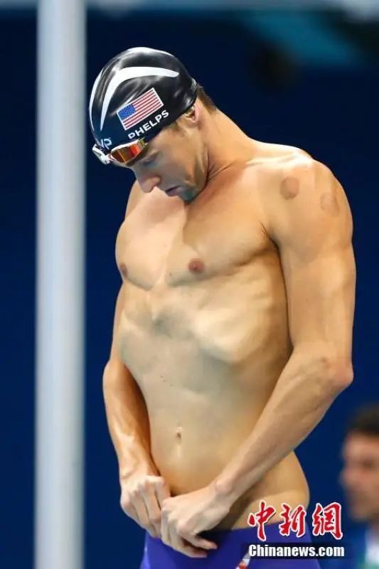 菲尔普斯入水瞬间,他背部拔罐后留下的紫色印记十分明显。