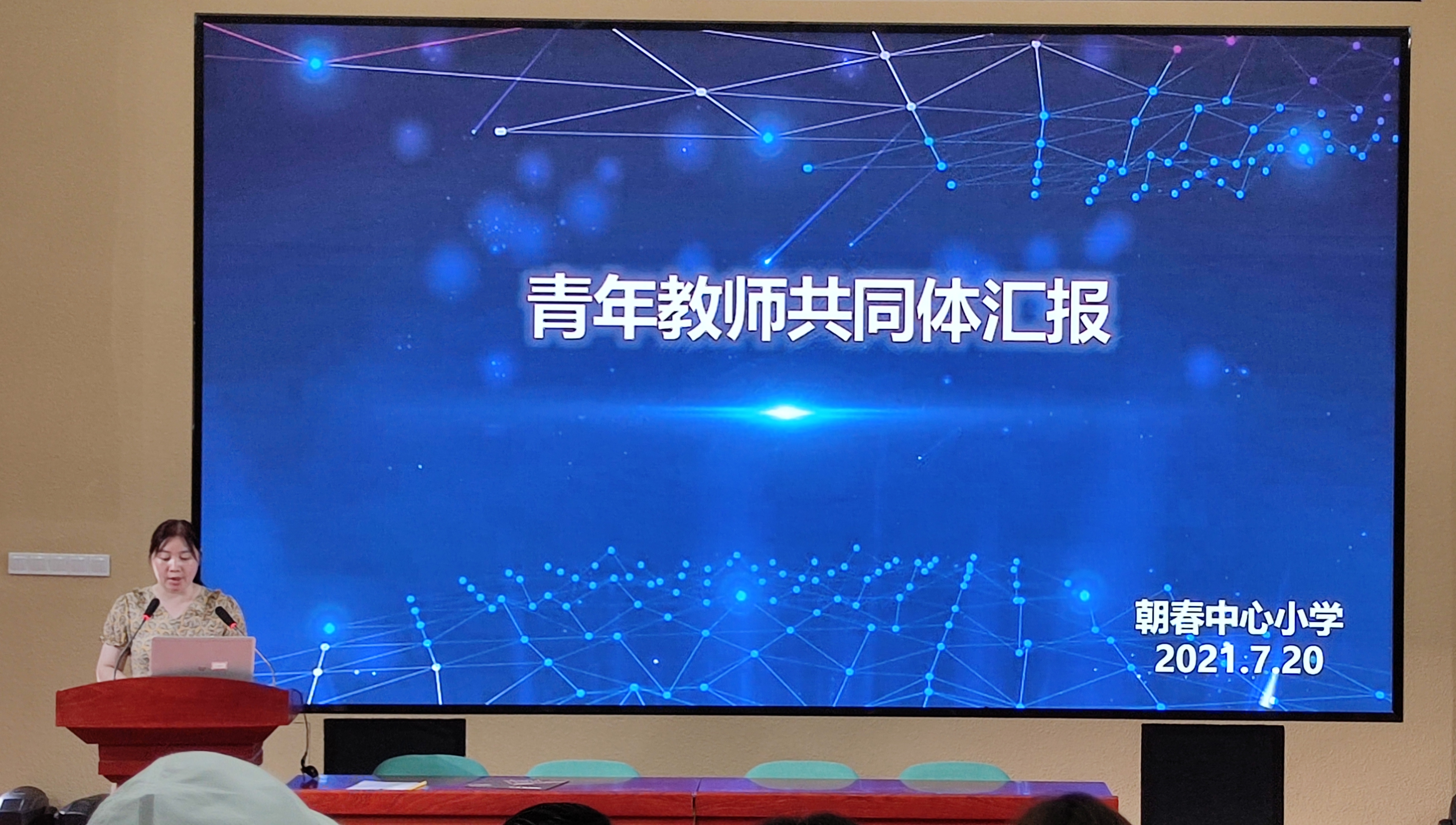 7月20日是朝春中心小学暑期的初次教师返校日。上午8:30,教师们在校讲演厅集中,听取青年教师共同体的工作汇报。教务处陆裕红主持了本次会议。