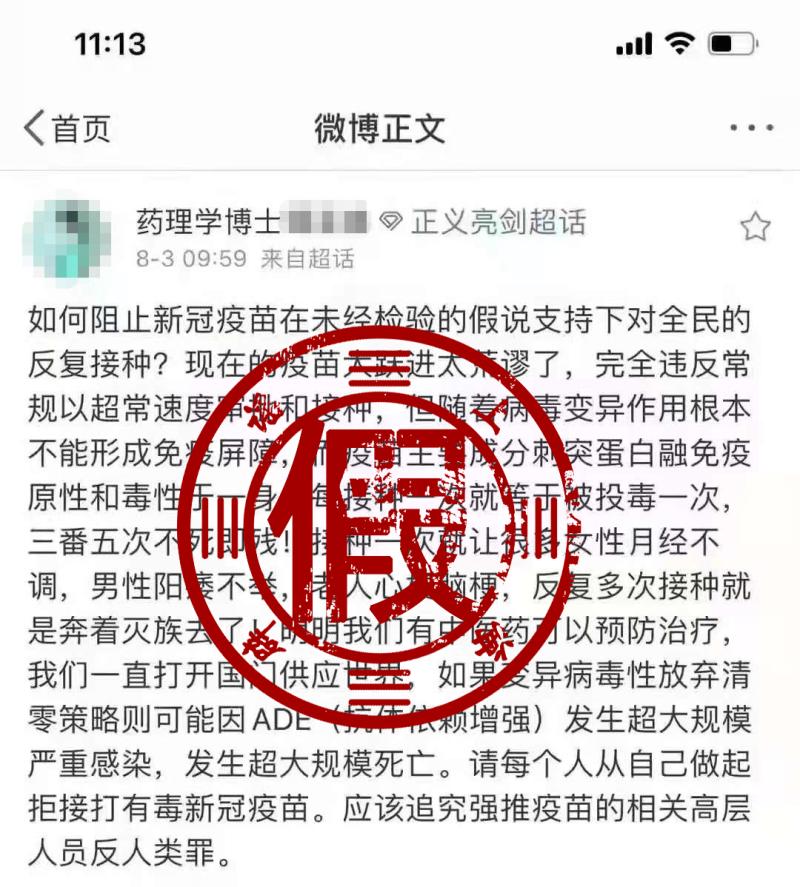 近日,在微博超话“正义亮剑超话”中,一位自称“药理学博士”的用户发表了一番言论,大意是“随着病毒变异,疫苗根本不能形成免疫屏障”“反复多次接种疫苗容易诱发ADE效应,发生超大规模严重感染甚至死亡,每接种一次就等于被投毒一次”。该用户还声称“有中医药可以预防治疗”,因此“每个人都应该拒绝接种新冠疫苗”。