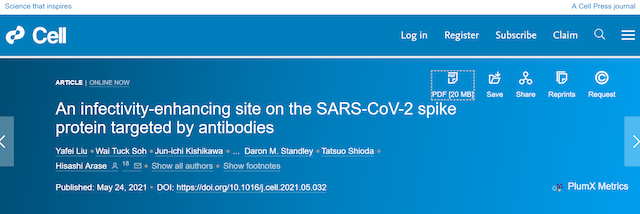 2021年5月25日,《细胞》杂志发表了一篇来自大阪大学尚志荒濑的论文《An infectivity-enhancing site on the SARS-CoV-2 spike protein targeted by antibodies》,论文阐述了感染新冠病毒的患者可能出现抗体增强,存在潜在的ADE效应。不过,研究者发现,这个可以诱发ADE的位点出现的频率极低。研究者认为,没有证据表明疫苗接种会诱导这种类型的抗体。