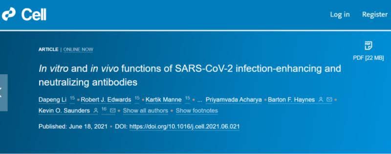 2021年6月18日,《细胞》杂志发表了杜克大学的一篇研究论文《In vitro and in vivo functions of SARS-CoV-2 infection-enhancing and neutralizing antibodies》,该研究表明感染增强型抗体在体外可以促进新冠病毒感染,而在体内并不会引起ADE效应。该结论为中和抗体应用和疫苗设计提供了有力的支持,也让很多人放心接种疫苗。