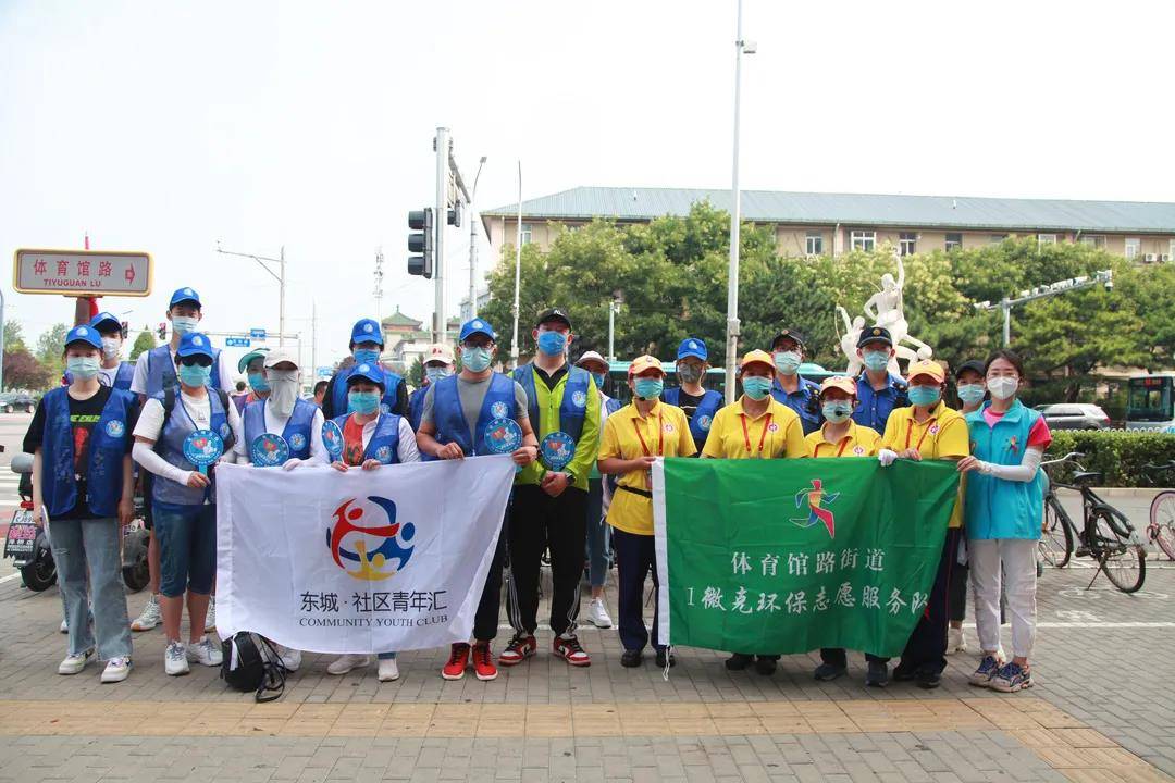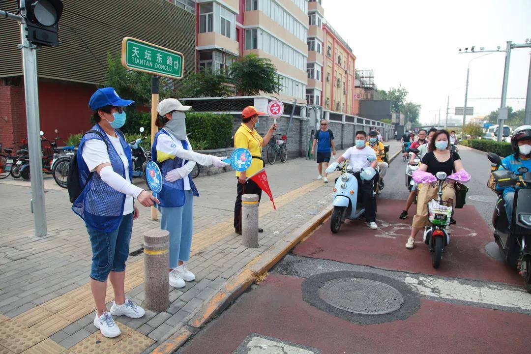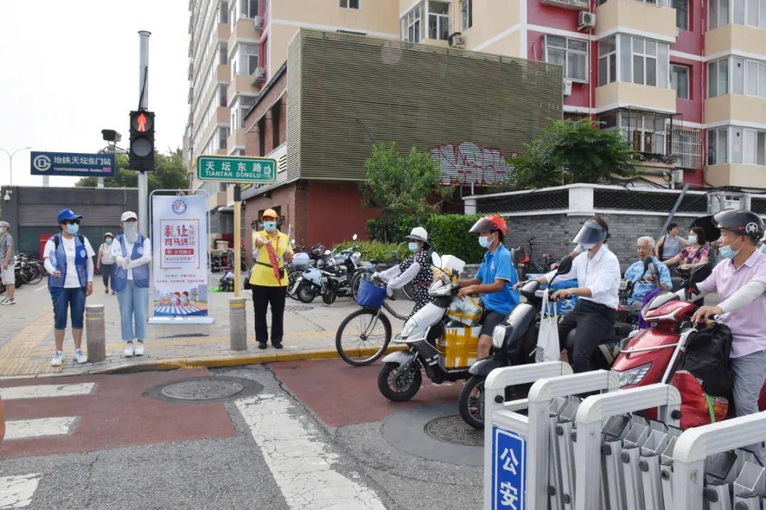 8月5日上午,正值早高峰,在体育馆街道天坛东门、体育馆路与体育馆西路交叉的交通路口两侧,身着柠檬黄的文明引导员和穿着蓝色志愿者马甲的青年志愿者正活跃在文明交通志愿服务活动中。