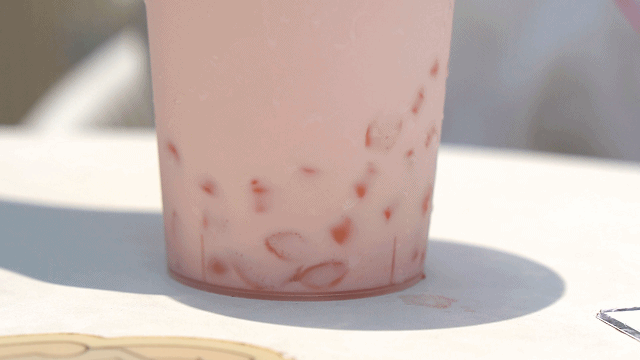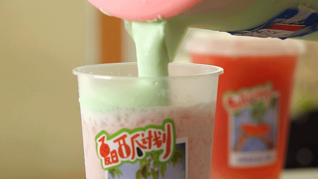 新鲜西瓜捣汁后加入生打椰摇杯,当西瓜红遇上奶油白结合成粉嫩的颜色,加上独家特制的奶盖,这一杯粉粉的西瓜饮品就做好啦!