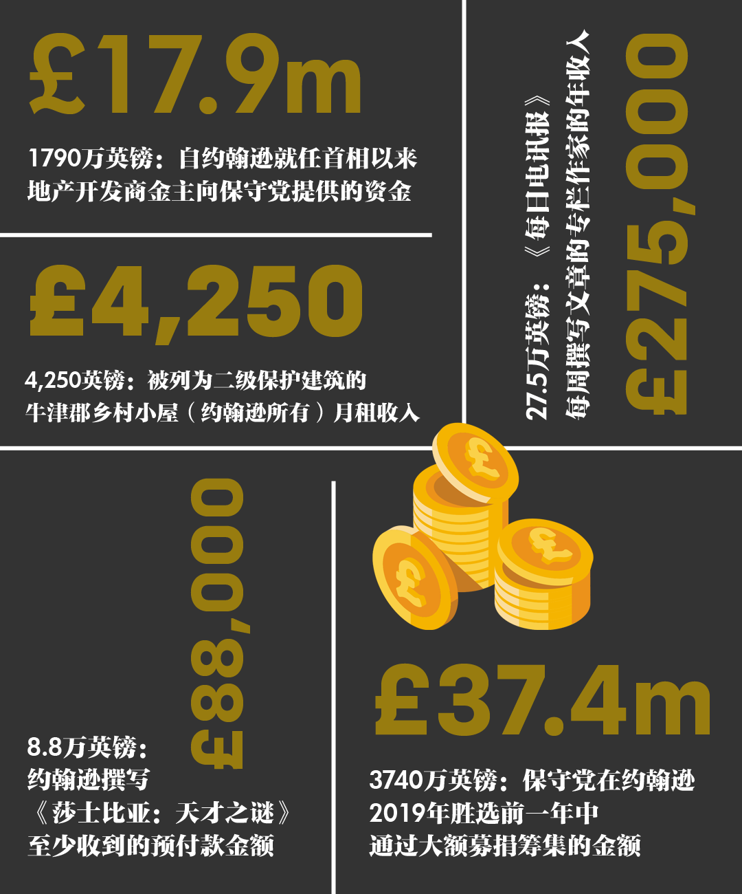 出任首相之前,约翰逊的年收入尚有83万英镑。2018至2019年,约翰逊做过21小时的演讲,还准备撰写一本关于莎士比亚的书,仅这两项“外快”就分别为约翰逊带来45万英镑和8.8万英镑入账。