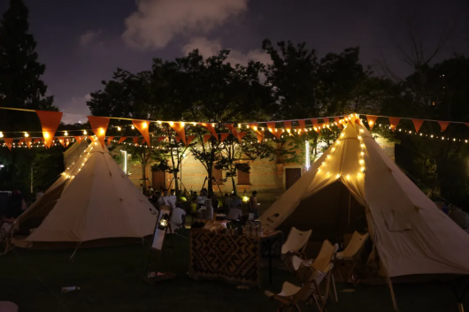 盛夏八月,落日余晖,白天的灼热散去,位于张杨路泾南路口李氏民宅前的户外草坪,进入热闹时刻:一顶顶帐篷下,大家或阅读作画,或与宠物嬉戏,或听着乐队演出静候露天电影开场……