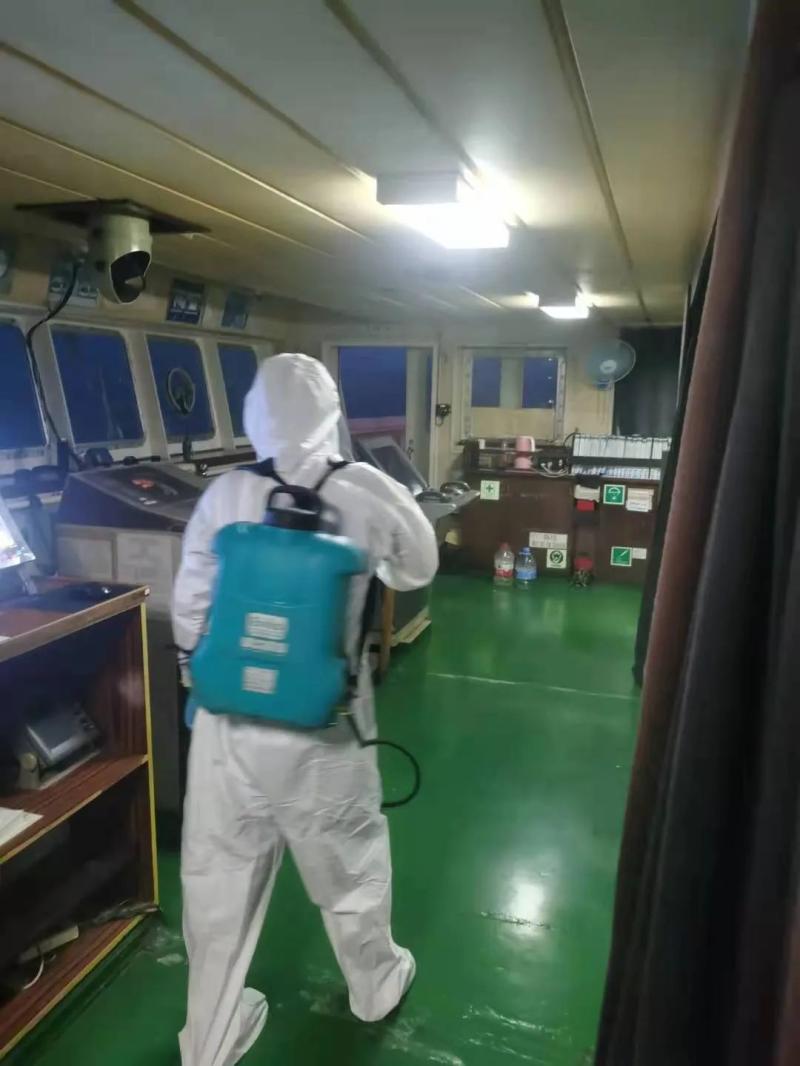 “弘进轮”船员进行消杀工作。图/受访者提供