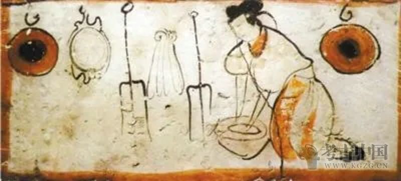 ▲嘉峪关古墓彩绘砖画——备食的侍女捧着羹盆