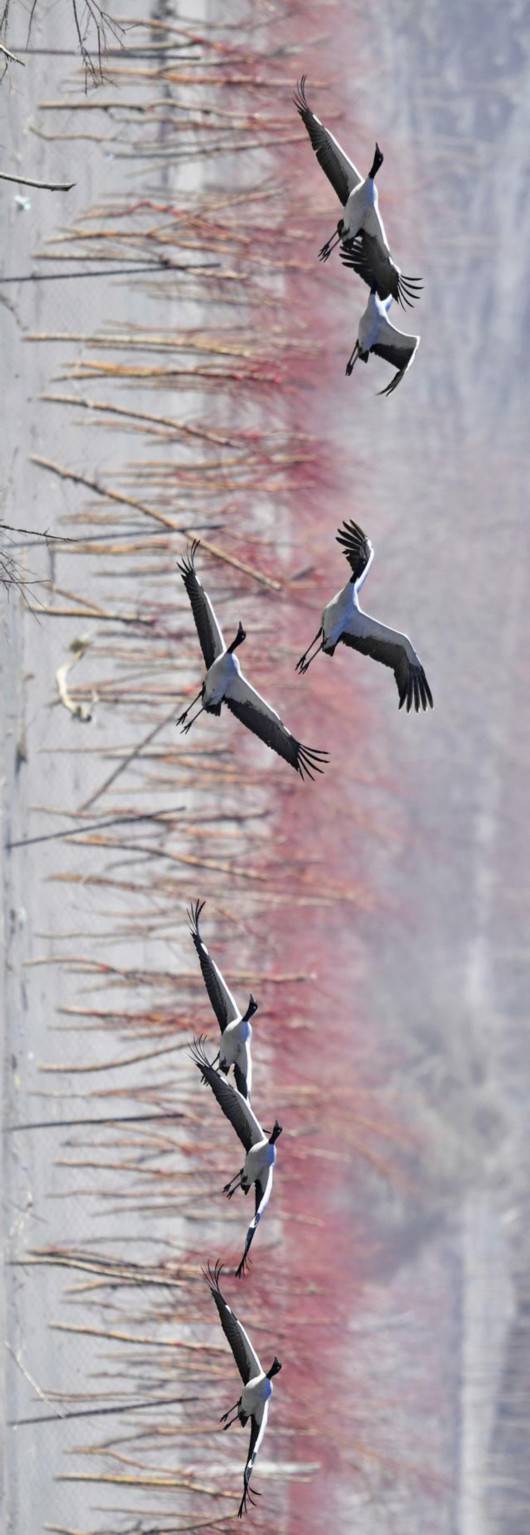 黑颈鹤被称为“鸟类大熊猫”,雅鲁藏布江及江畔的农田成了它们越冬的乐园。新华社记者 张汝锋 摄