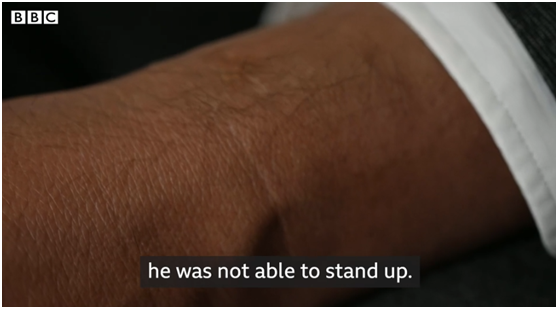 “‘他们’一直打他,用香烟烫他的手,把他的手绑起来像这样吊着,后来,他连站都站不起来”,迪丽娜扎边说边向BBC展示他父亲手上的痕迹。