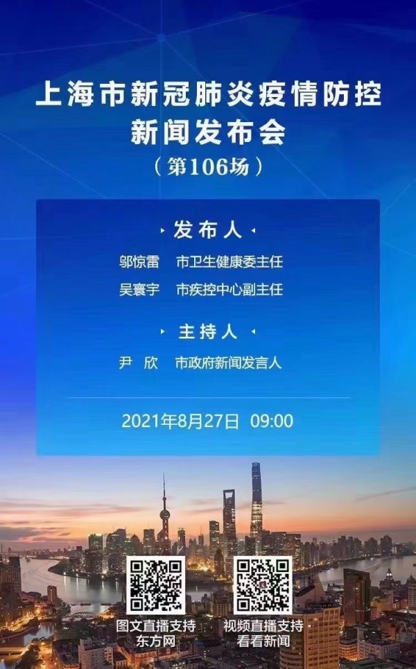 今天(8月27日)9:00,上海市新冠肺炎疫情防控新闻发布会(第106场)将举行,发布会邀请市健康卫生委、市疾控中心相关负责人及有关专家介绍情况。