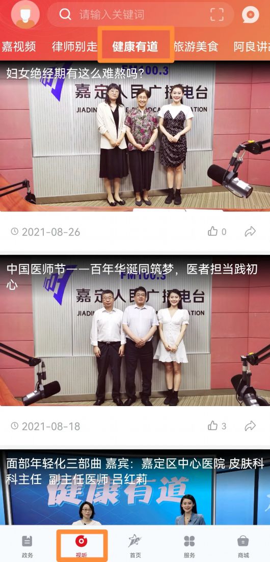 在“上海嘉定”APP首页中,点击“视听”按钮找到“健康有道”,可以回看往期节目。