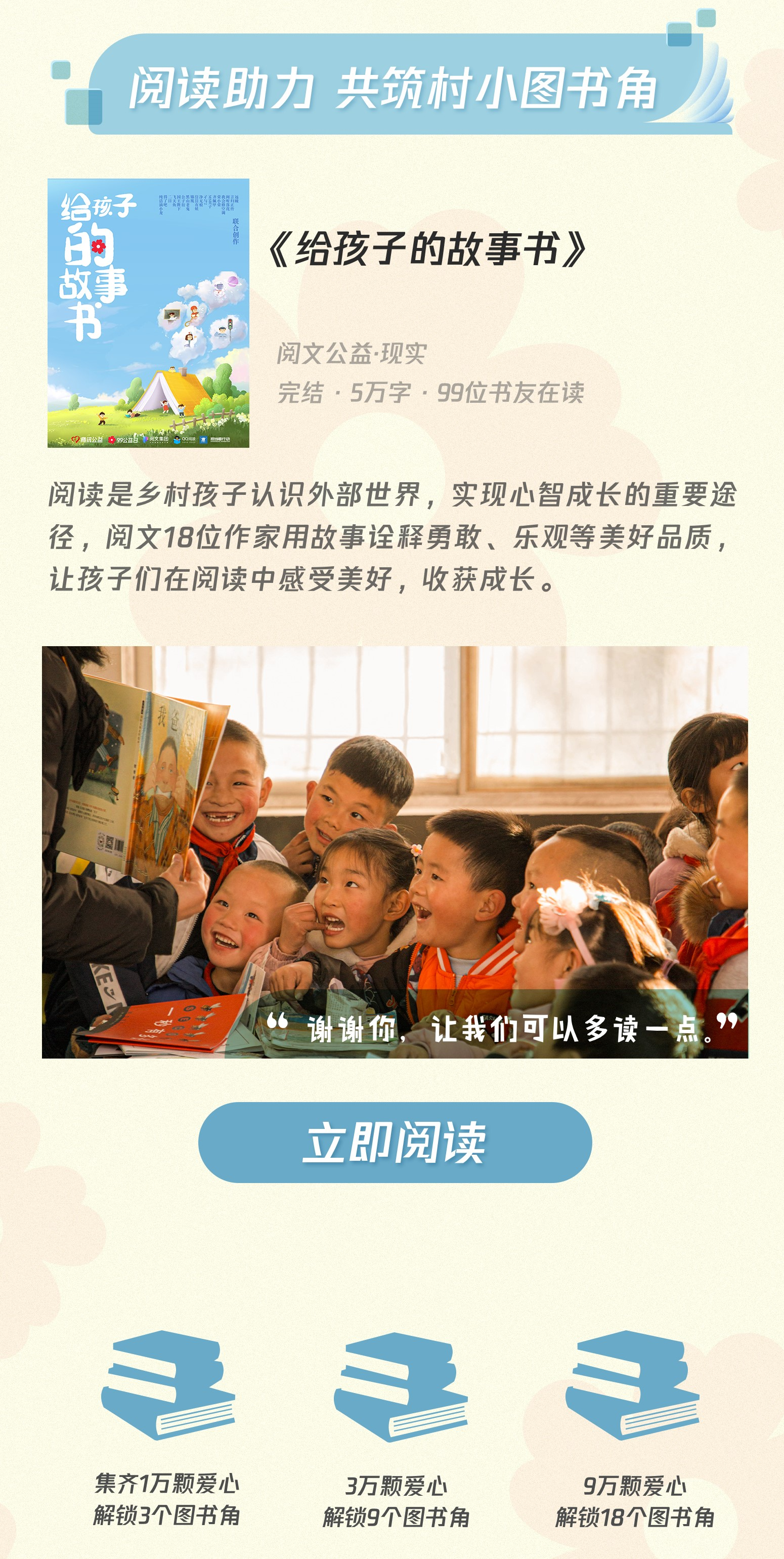 据《乡村儿童阅读报告》显示,中西部贫困地区儿童的课外阅读资源整体匮乏,74%受访乡村儿童一年阅读的课外读物不足10本,超过36%儿童一年只读了不到3本书,而一本课外读物都没有的乡村儿童占比近20%。这些均与城市儿童阅读情况形成鲜明对比。活动期间,读者前往QQ阅读APP、小程序均可阅读作家们创作的故事,搜索“给孩子的故事书”还可参与“益起读好书”公益行动,通过完成收藏、阅读、分享等阅读任务获得“爱心”,并根据“爱心”数量捐建“解锁”对应数量的乡村小学班级图书角。