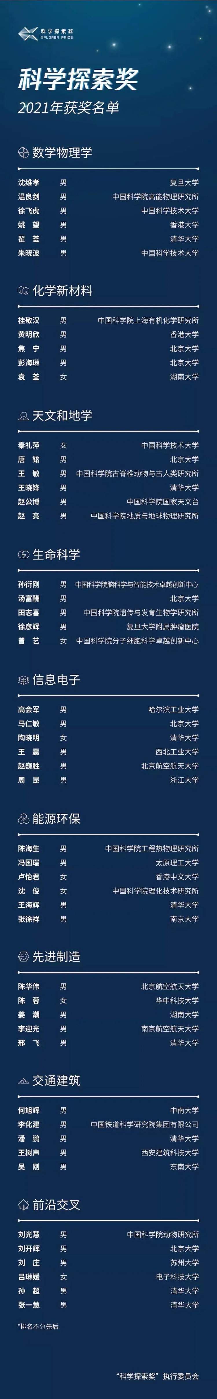 附:2021年“科学探索奖”获奖名单