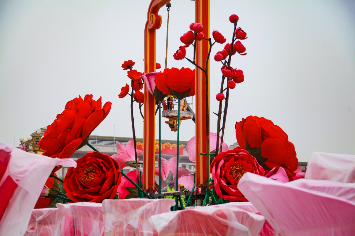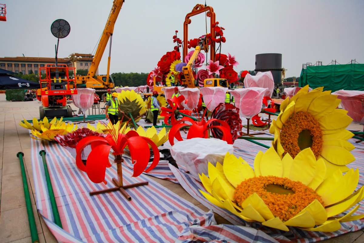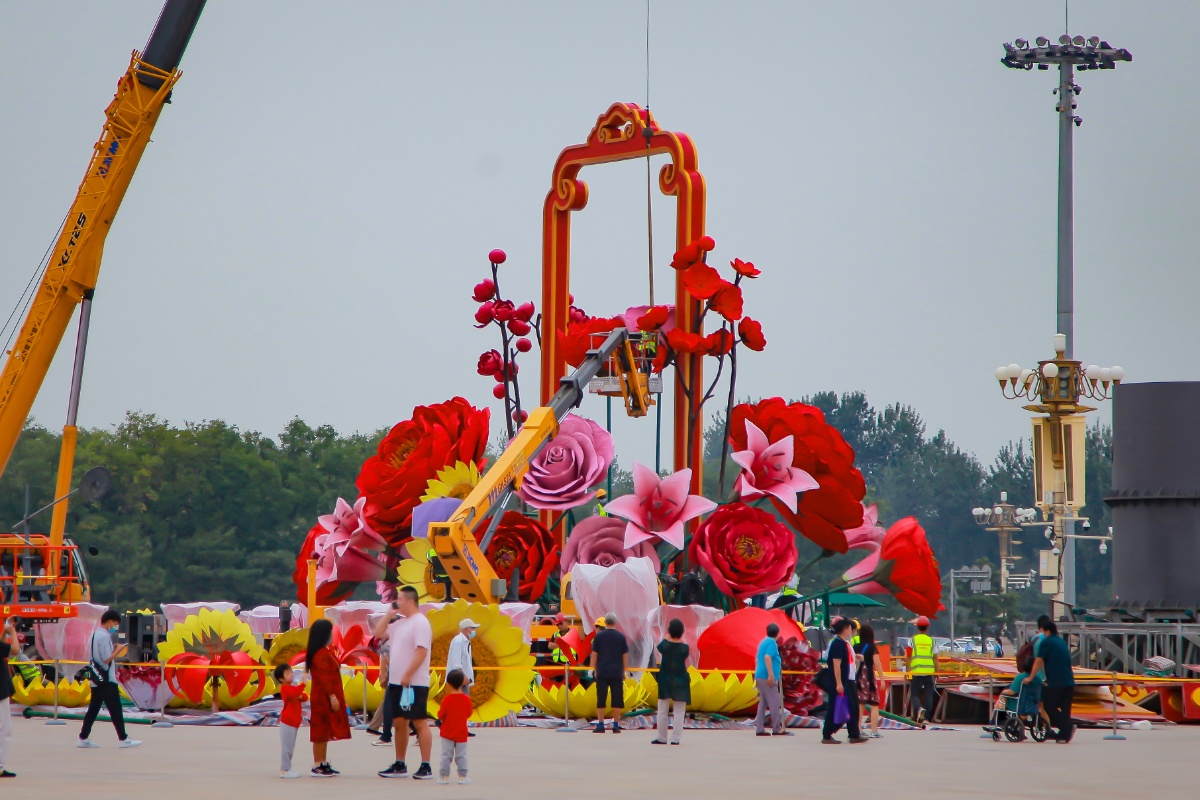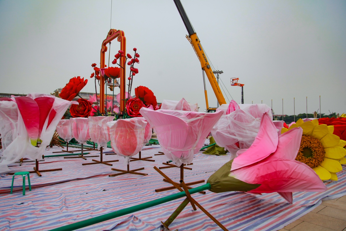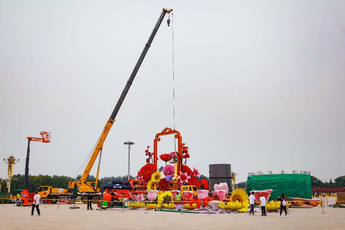 北京天安门广场开始布置高18米巨型主题花坛