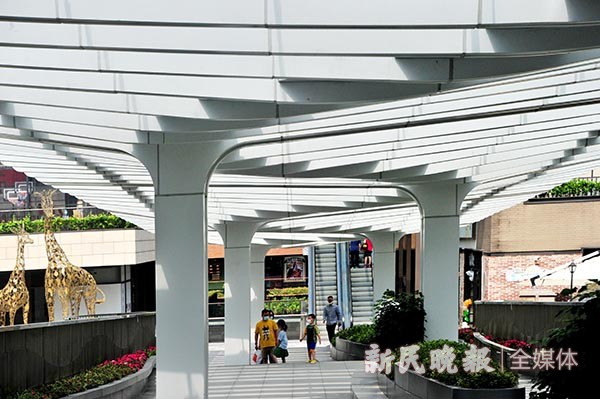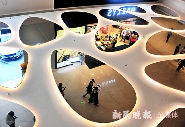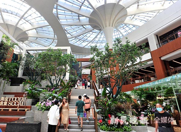 顾客漫步商区,阁楼层随处可见建筑结构的设计之美,自动扶梯勾勒出几何形的线条之美,穹顶上散落的光影与荷叶造型的生态设计有机融合,贯通月亮湾的连廊让人们置身于建筑之美的光影之中。