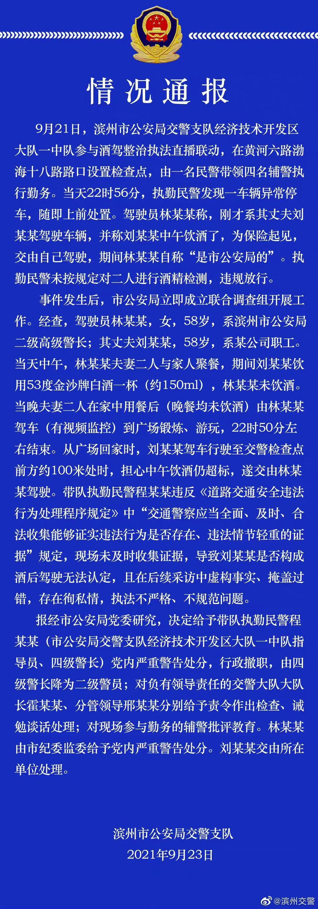 9月23日,山东省滨州市公安局交警支队通报称,此前引发舆论热议的通报查酒驾执法存在漏洞一事,经查,女驾驶员林某某,系滨州市公安局二级高级警长,其丈夫驾车行至检查点前方时,担心中午饮酒超标,交由林某某驾驶。