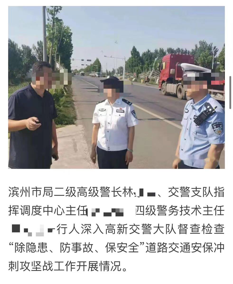 记者梳理发现,林某某的身份疑与滨州市公安局二级高级警长林某兰重合,在今年4月份,林某兰曾带队到滨州市公安局交警支队高新大队督察检查交通管理工作,在这次督察工作中,她对城乡统筹的酒驾醉驾专项整治行动给予充分肯定。