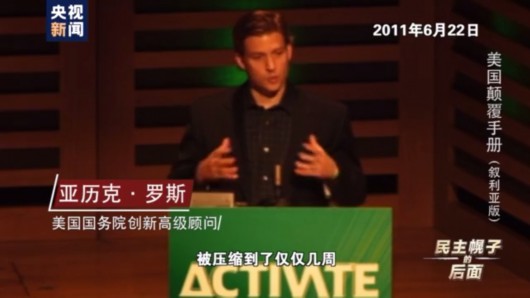 美国国务院创新高级顾问亚历克·罗斯:(互联网)就像一个“加速器”,所以传统意义上需要几个月,甚至数年的(政治)运动,被压缩到了仅仅几周。