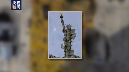 这是叙利亚艺术家塔姆曼·阿桑姆的作品。他用叙利亚的房屋残骸制作了自由女神像的电子副本,并称“这就是他们带给我们的自由”。