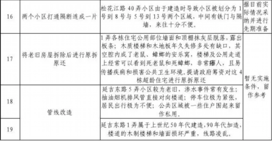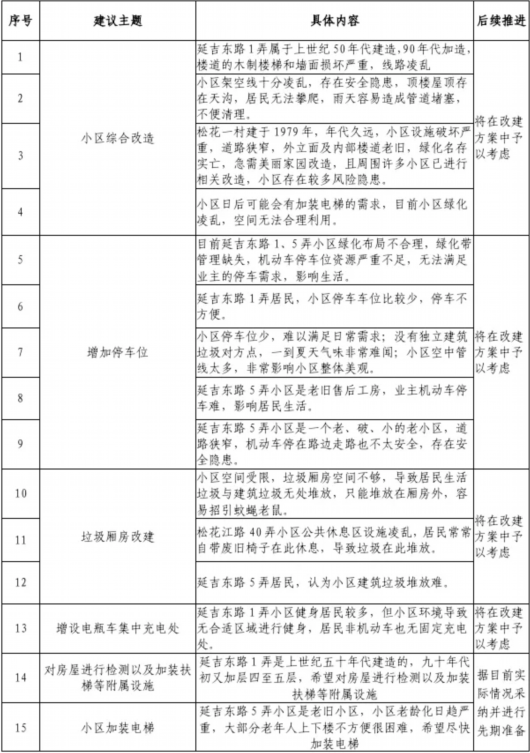 此外,居民提出“将老旧房屋拆除后进行原拆原还”、“管线改造”等2个方面3条建议,目前暂无实施条件,未来将结合实际情况再予考虑。