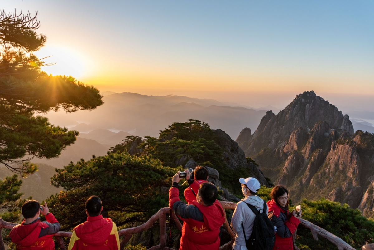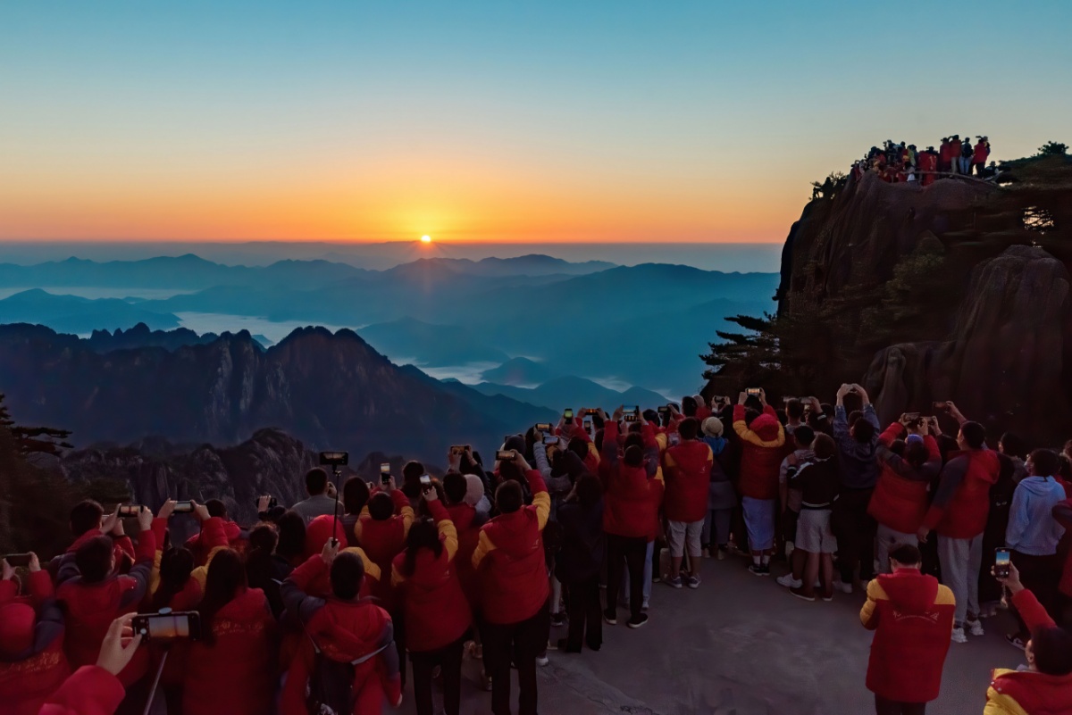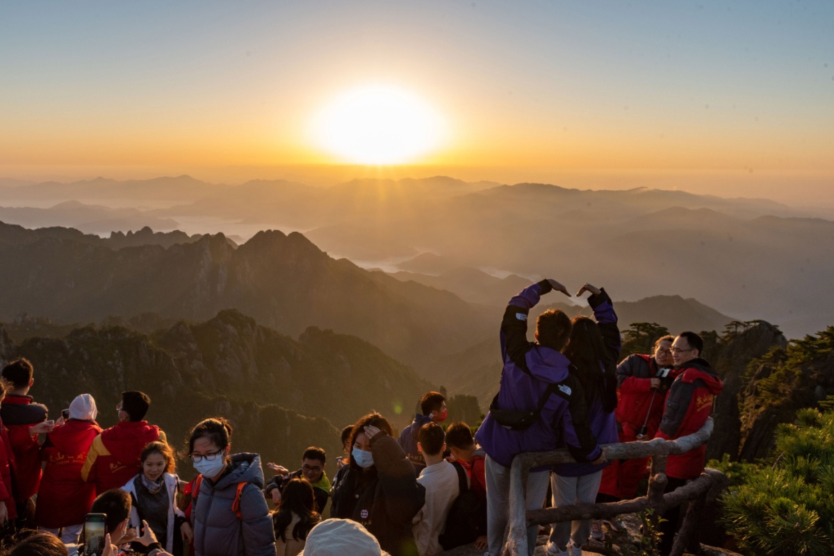 2021年10月1日晨,安徽省黄山市黄山风景区,游客们在光明顶看日出。