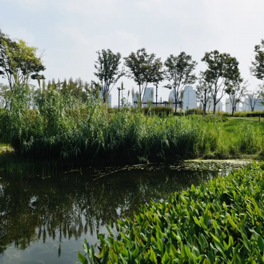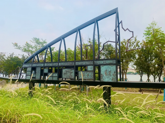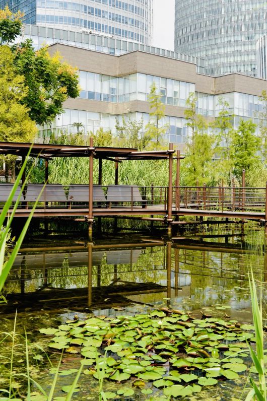 雨水花园是2009年东方渔人码头二期工程开工时,原有建筑拆除后形成的一片可以汇集雨水的低洼湿地。雨水花园使雨水可以就地消纳和吸收利用,从而保护场地水文现状,缓解城市内涝,调节城市微气候,体现了海绵城市理念。同时,配以廊桥、凉亭和景观栈桥,游人漫步于此可近距离感受工业历史的气息,也可休息小憩。