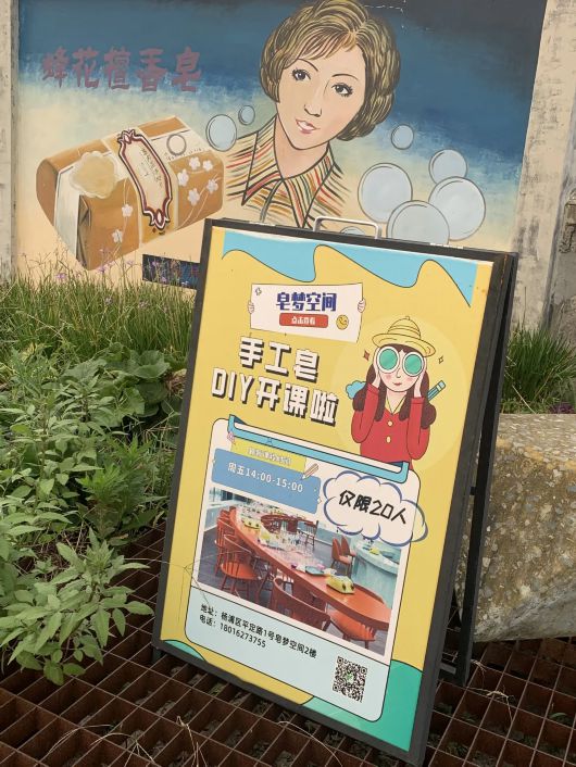 安浦路上旧上海制皂厂遗址区域,现在是网红打卡地皂梦空间。它是以制皂业为主题的景观与体验中心,依托制皂厂历史文脉故事、制作工艺流程、产品系列等内容,为市民打造集博物展览、手工互动和特色咖啡于一体的特色空间。游客可以坐在沉淀池里喝咖啡,环顾四周是纵横交错的圆筒状大型输送管道。池子上方的一抹蓝天抬头可见,仿佛置身于百年前的制皂工艺现场。