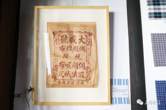 这里还陈列着一件“镇馆之宝”——“大盛号”绸缎棉布统办精美礼券,是晚清至民国时期一名远嫁河南的松江姑娘的嫁妆。“大盛号”为当时的大盛新绸缎局,总店位于马路桥,分店则位于松江仓桥街东。经推断,正是现在松江布展示馆所在地。这张礼券此前作为包装纸用于包布,亦可视作是那个时代的广告宣传纸。