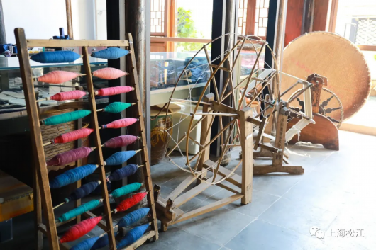 在三进展厅内,陈列着黄道婆改良后的三锭棉纺车、手摇纺线机以及几架老式织布机,仿佛诉说着岁月里的松江故事。