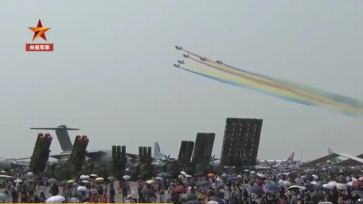 10月1日,空军八一飞行表演队6架歼-10用红、黄、蓝三色拉烟为新中国庆生,寓意人民空军永远忠于党、永远忠于国家。