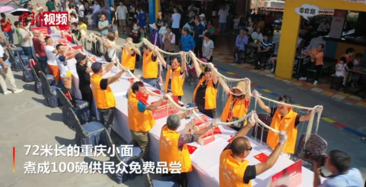 10月1日,重庆涪陵美心红酒小镇特邀养老院的老人、周边村落的老人等,以及游客们共同参加“庆生长桌宴”,免费品尝全手工制作的“国庆长寿面”。长寿面总长72米,煮成100碗重庆特色小面,供民众免费品尝。