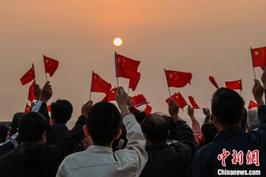 当一轮红日从海平面上冉冉升起,游客们共唱国歌。李信君摄