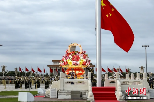 10月1日,北京,数万人前往天安门广场观看升旗仪式。游客们纷纷拿出手机,记录下这庄严的时刻。