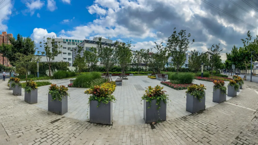 在路口转角、广场节点处布置花境,使游赏序列更显活泼,提供步移景异的户外林下活动空间。保留祁连山南路沿路原有成排的落羽杉乔木风貌,新种纳塔栎、无患子、香泡等“四化”木本植物。待春暖花开,新梢鸟儿迎风唱,再盼景观廊架上凌霄挂朵,可谓“风暖鸟声翠,闲待花满廊”。