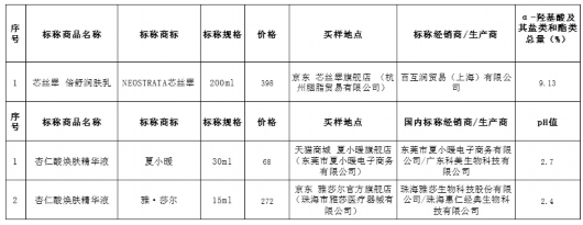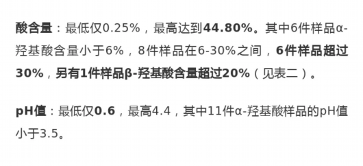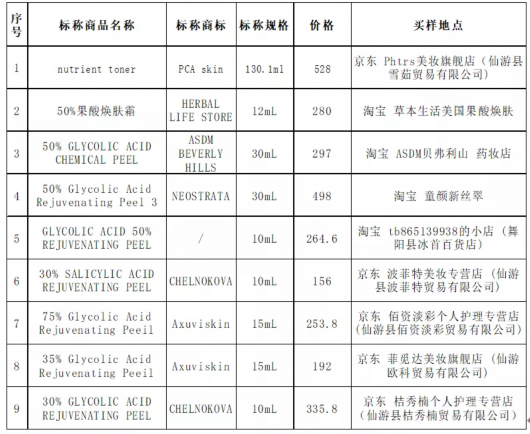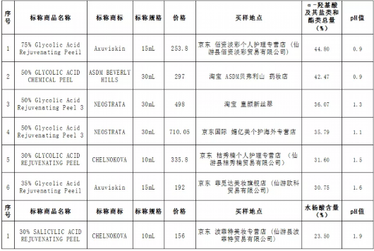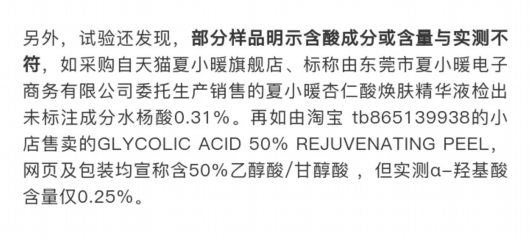 3. 部分样品明示含酸成分或含量与实测不符,如检出未标注成分水杨酸,宣称含50%甘醇酸,但实测仅0.25%。
