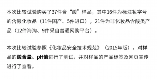 市消保委说,近日,其对“刷酸”产品开展了比较试验。本次比较试验购买了37件含“酸”样品,其中16件为标注妆字号的含酸化妆品(11件国产、5件进口),21件为非化妆品含酸类产品(12件海淘、9件采自普通网购平台)。他们在试验中发现了:标注妆字号的样品总体情况较好;部分含酸类样品(非化妆品)的酸含量、pH值差异较大;部分样品明示含酸成分或含量与实测不符等情况。详情↓