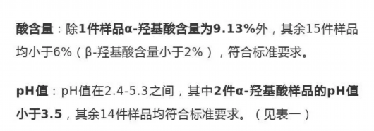 2. 部分含酸类样品(非化妆品)的酸含量、pH值差异较大,酸含量最高达到44.80%,pH值最低仅0.6。