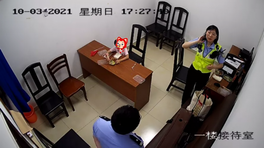 小女孩在游客服务中心等了半个小时,没有见家人过来。殷行派出所民警张欣然将小女孩带回派出所照顾,并给小女孩安排了晚饭。