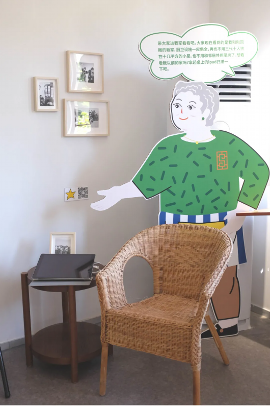 原来,在策展过程中,策展方得知有一位与曹杨新村“同龄”的新村居民,从出生的第一天起就住在曹杨新村,至今已有70年,便突发奇想地将其设计成一个卡通形象——“曹阿姨”,并通过她生活中的不同场景来展现新村的日常。