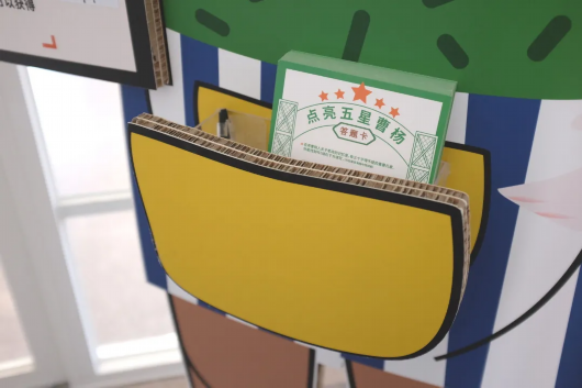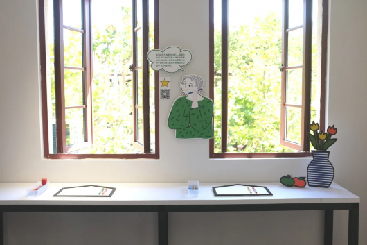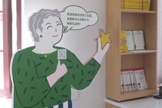 来到三楼后可以看到在入口处迎接大家的“曹阿姨”,大家可以从“曹阿姨”的围兜中抽取答题卡或扫描二维码,就可以参与展览互动。
