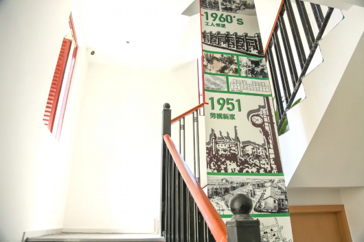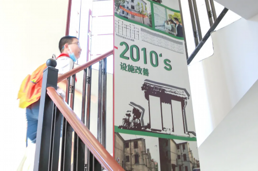 9米高的挑空幕布展现了曹杨一村70年间的变迁,大家在前往三楼主展区的过程中,可以观察到幕布逐渐由黑白变为了彩色,老照片也变为改造后的新场景。