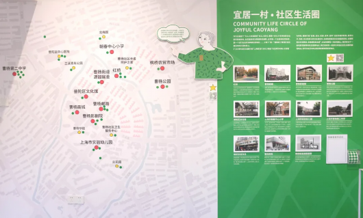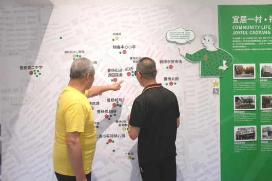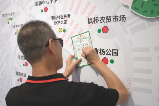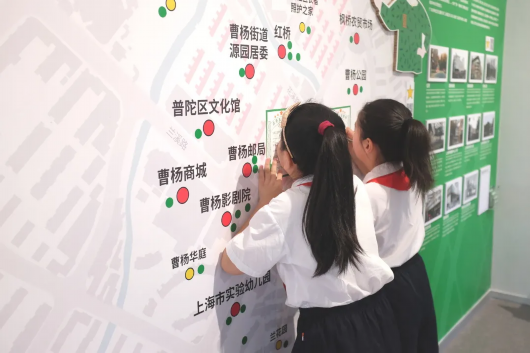来到主展区后,曹杨故事将按顺时针展开以一村为圆心的曹杨“15分钟社区生活圈”地图,标注了一些老居民推荐的社区重要地点,大家可以为自己喜爱的点位投票或者推荐新的地点。