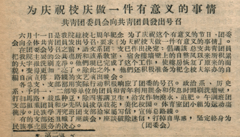 六月十一日是我院建校七周年纪念,为了庆祝这个有意义的节日,团委会向全体共青团员发出号召,要求“为庆祝校庆做一件有意义的事情”。在团委会号召之前,语文系团总支已作出决定:倡议该总支共青团员把我院主要的公共场所和该系教室、宿舍楼墙壁上的自整风以来所积累的大字报洗刷干净。他们现已完成了这个工作,使楼房恢复了原来的面貌,变得更加漂亮了。除此之外,他们还积极准备为纪念校庆举办的自编自演宣传总路线的文艺演出晚会。