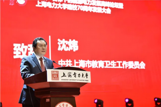 沈炜在大会上致辞。他指出上海电力大学是一所具有优良办学传统、深厚文化底蕴和鲜明办学特色的市属理工科大学,素有“电力工程师的摇篮”之美誉。70年来,上海电力大学认真贯彻党的教育方针,落实立德树人根本任务,聚焦服务国家能源战略,践行“务实致用,明理致远”的办学理念,秉持“立足电力、立足应用、立足一线”的办学特色,逐步形成了紧密结合能源电力生产,服务经济建设与社会发展的办学思路,在人才培养上取得了新成效,在学科建设和科技创新上取得了新进展,在教育对外开放上迈出了新步伐,在学校内部治理上形成了新机制,为国家能源电力建设和上海经济社会发展作出了重要贡献。希望学校站在新的起点上,主动对接国家“双碳”战略目标任务,紧紧围绕上海创新转型的现实需要,全力推进高水平地方大学建设,为上海高等教育事业做出新的更大贡献。