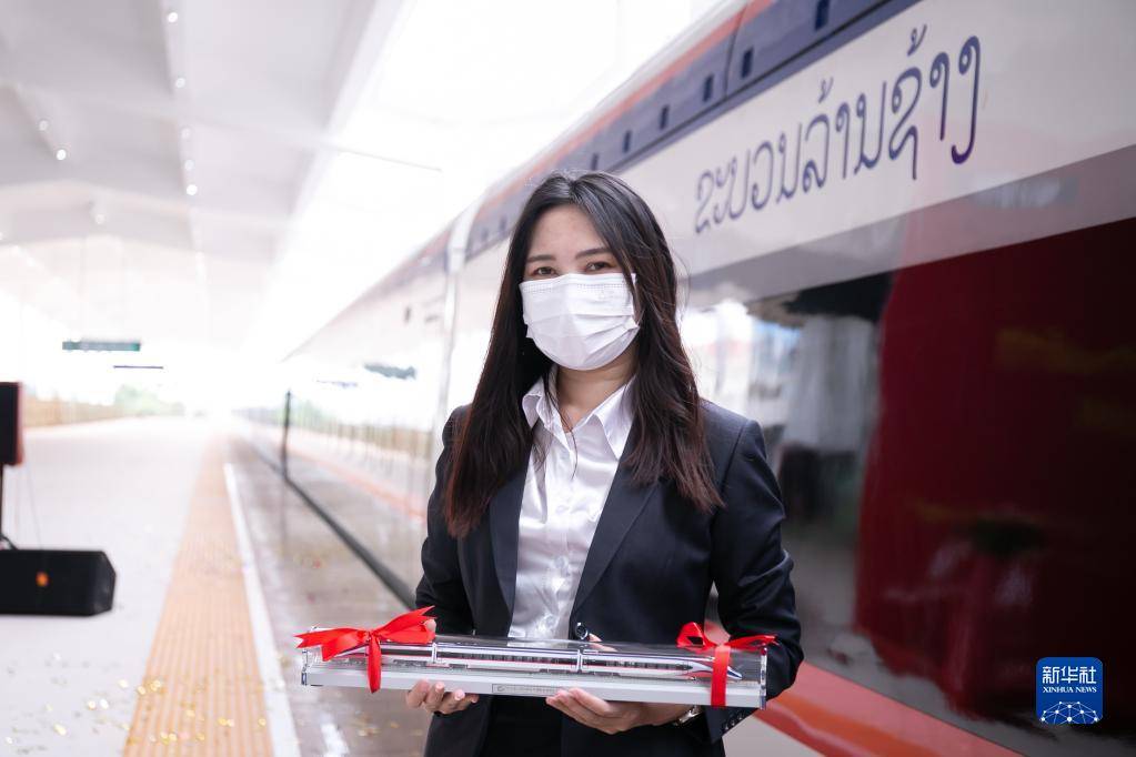 10月16日,艾丽雅持模型在老挝首都万象火车站与“澜沧号”动车组合影,艾丽雅在中老铁路有限公司新闻部工作。新华社发(凯乔摄)