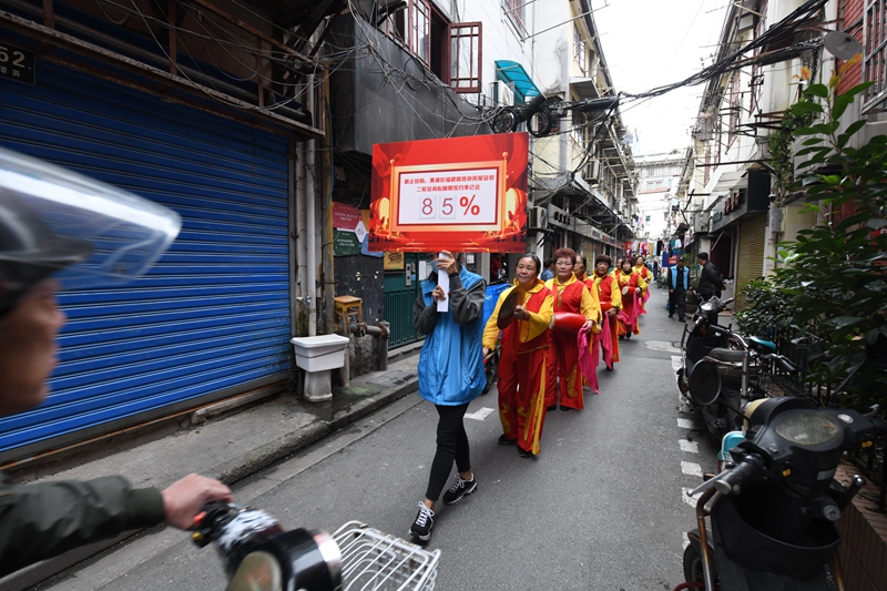 “咚咚咚!庆祝旧改生效的腰鼓队来啦!”昨天上午,居民蔡玉平骑着自行车赶回黄浦区无锡小区,带来了一个好消息——外滩街道福建路地块二轮征询酝酿期首日上午10时40分,居民签约率已达85.19%,旧改正式生效。截至17日23时59分,签约率已达99.02%。