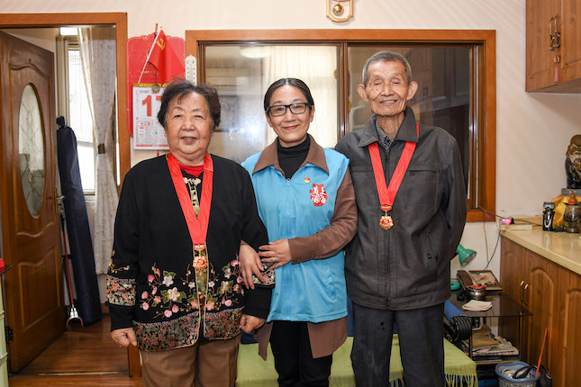 与此同时,87岁的党员居民索月仙换上新装,催促老伴拿出两人的“光荣在党50周年”纪念章。因为当天,外滩街道无锡路居委会主任凌激要来家里为老人拍照留念。