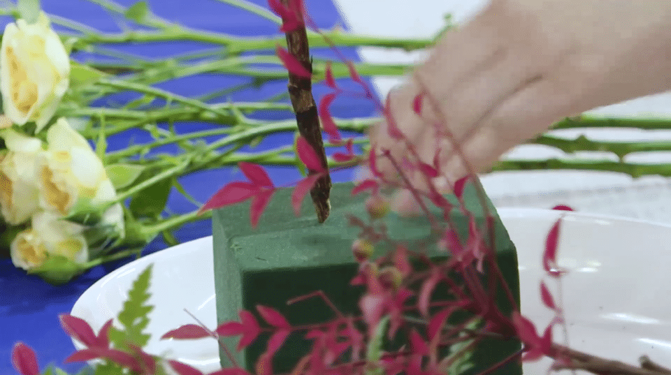 将南天竹第一主枝插在作品中间位置,主枝要根据南天竹的向阳面,旋转至观赏位置。第二枝的高度在第一枝高度的2/3处。