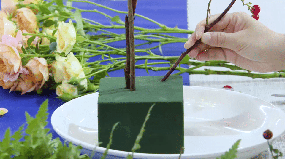 根据海棠果枝的造型,第一枝选择枝干有曲度,向前延伸,第二枝选择在南天竹和第一枝之间的空间高度,最好可以四面观,靠近作品的中心处插入,丰富作品的空间感,完成作品的高度和深度定位。
