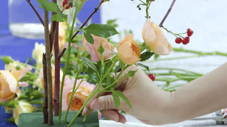 月季花按照颜色,高低错落插在作品中心位置,一般靠近南天竹的月季插高些,高度在最高南天竹高度的1/3处,插出不同的高度和层次,表现不同的点和面的变化。
